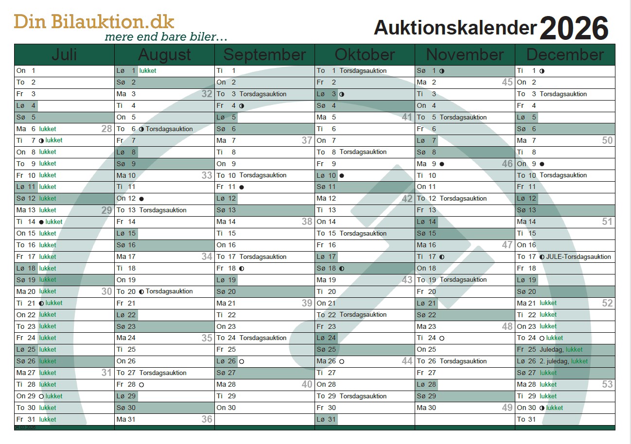 Vi afholder bilauktion hver torsdag kl. 15.00 (undtagen i juli og på helligdage), hvor et bredt udvalg af biler, varebiler og andre køretøjer kommer under hammeren. Du kan inspicere køretøjerne fra kl. 13.00, så du har god tid til at se nærmere på det, du har i kikkerten.